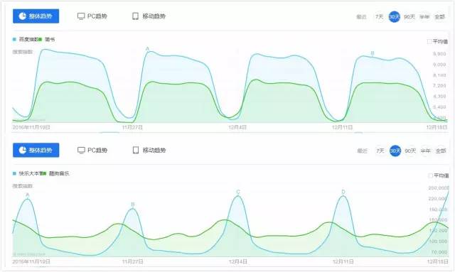 a. 如“百度指數(shù)”、“簡書”這類詞的趨勢是以周為周期的,且在周末降為波谷;“快樂大本營”“酷狗音樂”這類詞則在周末升為波峰。原因是前者多為工作性質(zhì)的關(guān)鍵詞(用戶多在工作日搜索),后者多為娛樂性質(zhì)的關(guān)鍵詞(用戶多在周末搜索)。