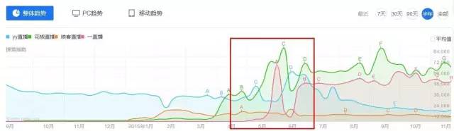 以直播行業(yè)為例。近一年來,視頻直播軟件層出不窮,多個(gè)產(chǎn)品之間可謂此消彼長,競爭激烈。在今年4-6月份有一場混亂的大戰(zhàn)后,各家產(chǎn)品在7月之后的搜索趨勢也趨于平緩和穩(wěn)定。特別地,在直播行業(yè)被爆出數(shù)據(jù)造假之后,相信直播行業(yè)的發(fā)展將會(huì)更加健康和理性。