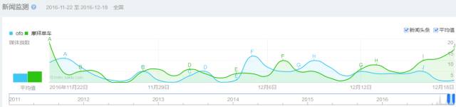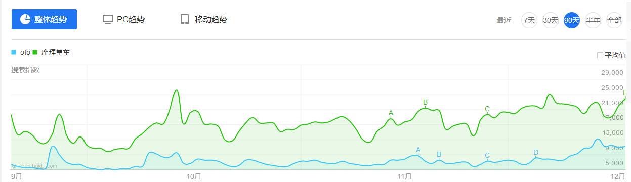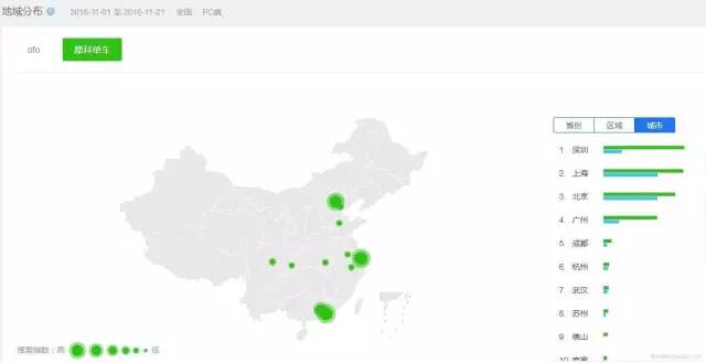 如果說搜索趨勢只是宏觀上展現(xiàn)關(guān)鍵詞的搜索熱度和關(guān)注度,那么競品對(duì)比分則析 可以幫助使用者更好地了解市場競爭情況。下面,我們以ofo和摩拜單車為例,來看看怎么用百度指數(shù)做競品分析。