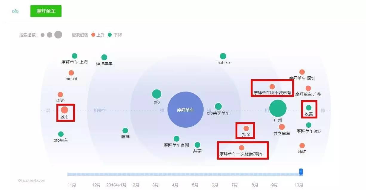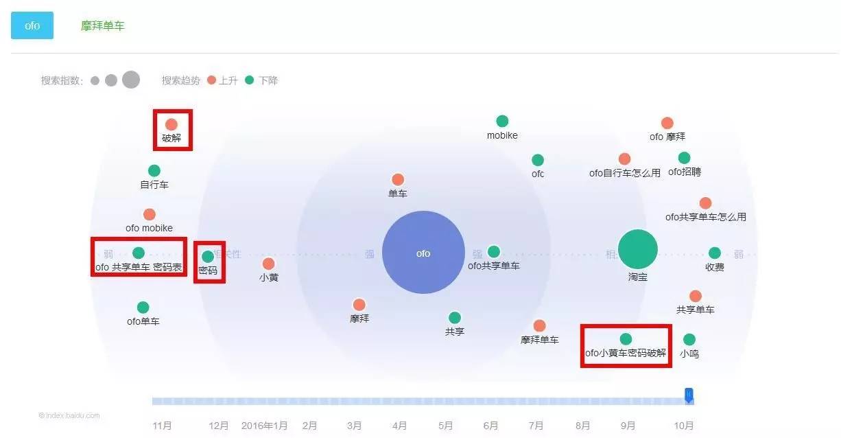 搜索ofo的可能還會(huì)搜摩拜、破解、密碼表之類的關(guān)鍵詞。另外,拖動(dòng)時(shí)間軸上的小滑塊,還可以查看一段時(shí)間內(nèi)的需求變化。比如“破解密碼”之類的檢索需求是在逐漸向外(變?nèi)酰?/span>且變綠(趨勢下降)的,這可能與ofo改造密碼鎖有關(guān)。